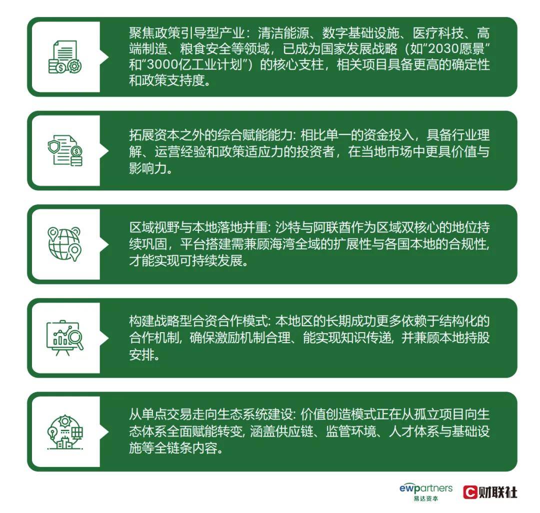 起首,聚焦国度政策支撑的沉点范畴是当前最具确定性的径。能源转型、数字根本设备、医疗科技、先辈制制和粮食平安等标的目的,曾经成为沙特“2030愿景”和阿联酋“3000亿工业成长打算”等计谋的焦点构成部门,这些赛道正在政策支撑和市场需求的双轮驱动下,具备持久成漫空间。