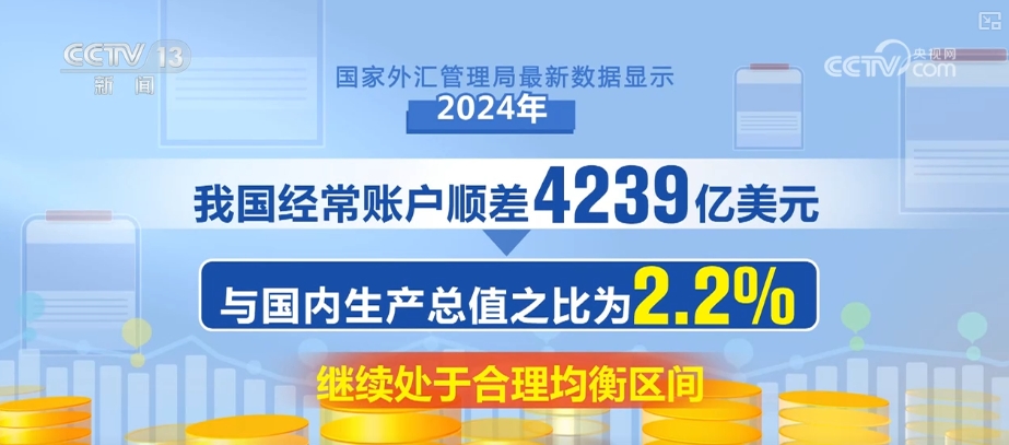 国度外汇办理局最新数据显示,2024年,我国经常账户顺差4239亿美元,取国内出产总值之比为2。2%,继续处于合理平衡区间。外商间接投资本钱金新增909亿美元,2024岁暮,我国对外净资产为3。3万亿美元,增加15。6%。