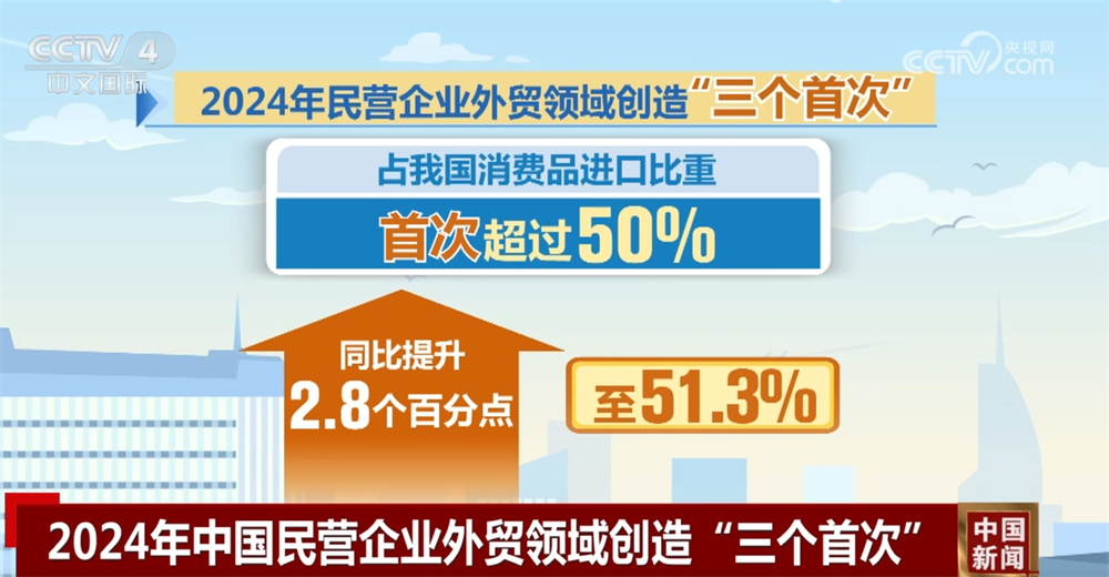第三个初次,是占我国消费品进口比沉初次跨越50%,同比提拔2。8个百分点至51。3%,此中正在日化用品、生果等产物中比沉跨越六成。2024年,平易近营、外资、国有企业三大类外贸运营从体活跃度不竭提拔,全年有进出话柄绩的企业近70万家,数量再立异高。