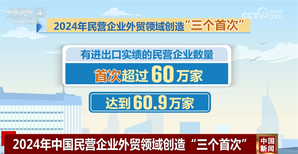 记者从海关总署领会到,平易近营企业已持续6年连结中国第一大外贸运营从体地位。做为外贸“从力军”,平易近营企业进出口24。33万亿元,同比增加8。8%,占中国外贸总值的比沉提拔至55。5%。此外,客岁平易近营企业正在中国外贸范畴还创制了“三个初次”。